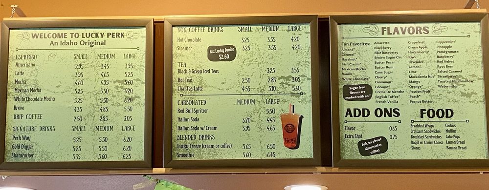 Introducing Lucky Perk Coffee, a cozy coffee shop located at 1551 W Cherry Ln Meridian, ID. This coffee haven offers a variety of options for coffee enthusiasts, with rave reviews from customers praising the friendly staff and comfortable ambiance. The menu features specialty drinks like the hot or iced or blended gold digger, a fan favorite since 2018. Customers also appreciate the affordable pricing and the option for a loyalty stamp card, a rare find in today's coffee scene. With offerings of hot, iced, or blended drinks, Lucky Perk Coffee caters to all tastes and preferences. Whether you're looking for a relaxing place to catch up with friends or a quiet spot to study, Lucky Perk Coffee provides a welcoming environment with top-notch service and delicious coffee.